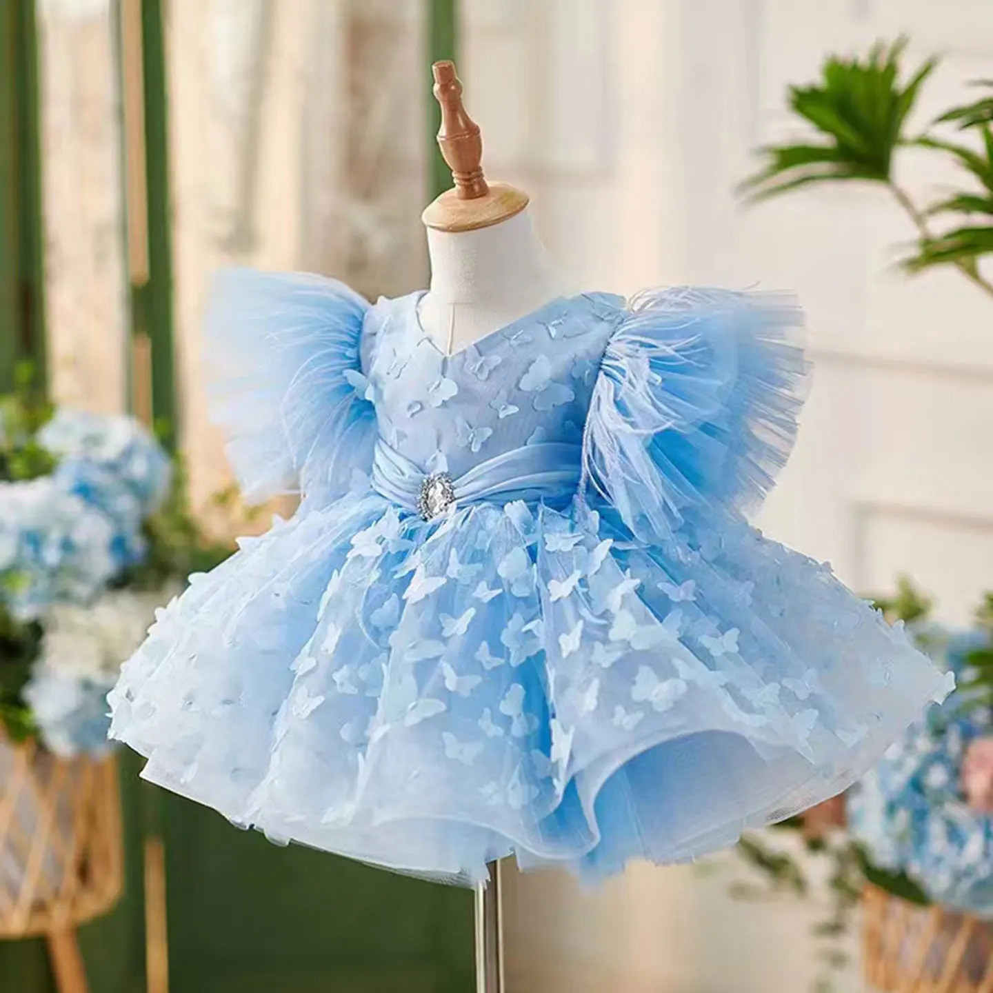 Elegant Butterfly Designed Blue Flower Girl Dress with Hairband
