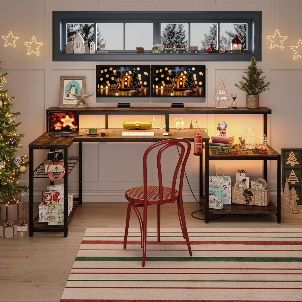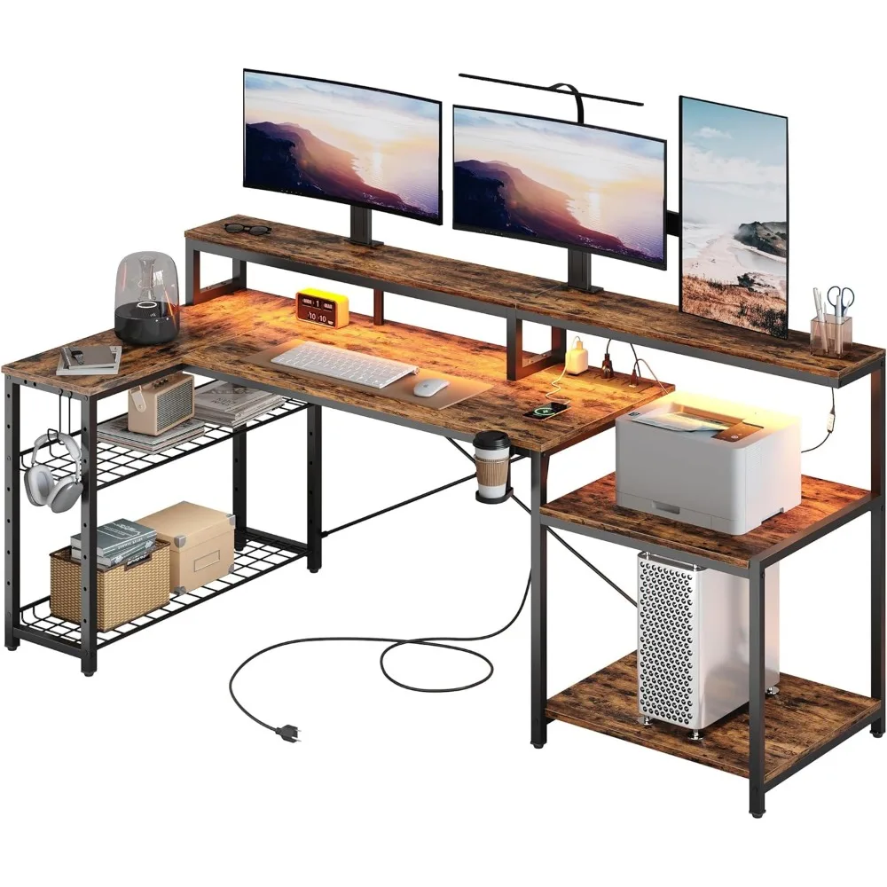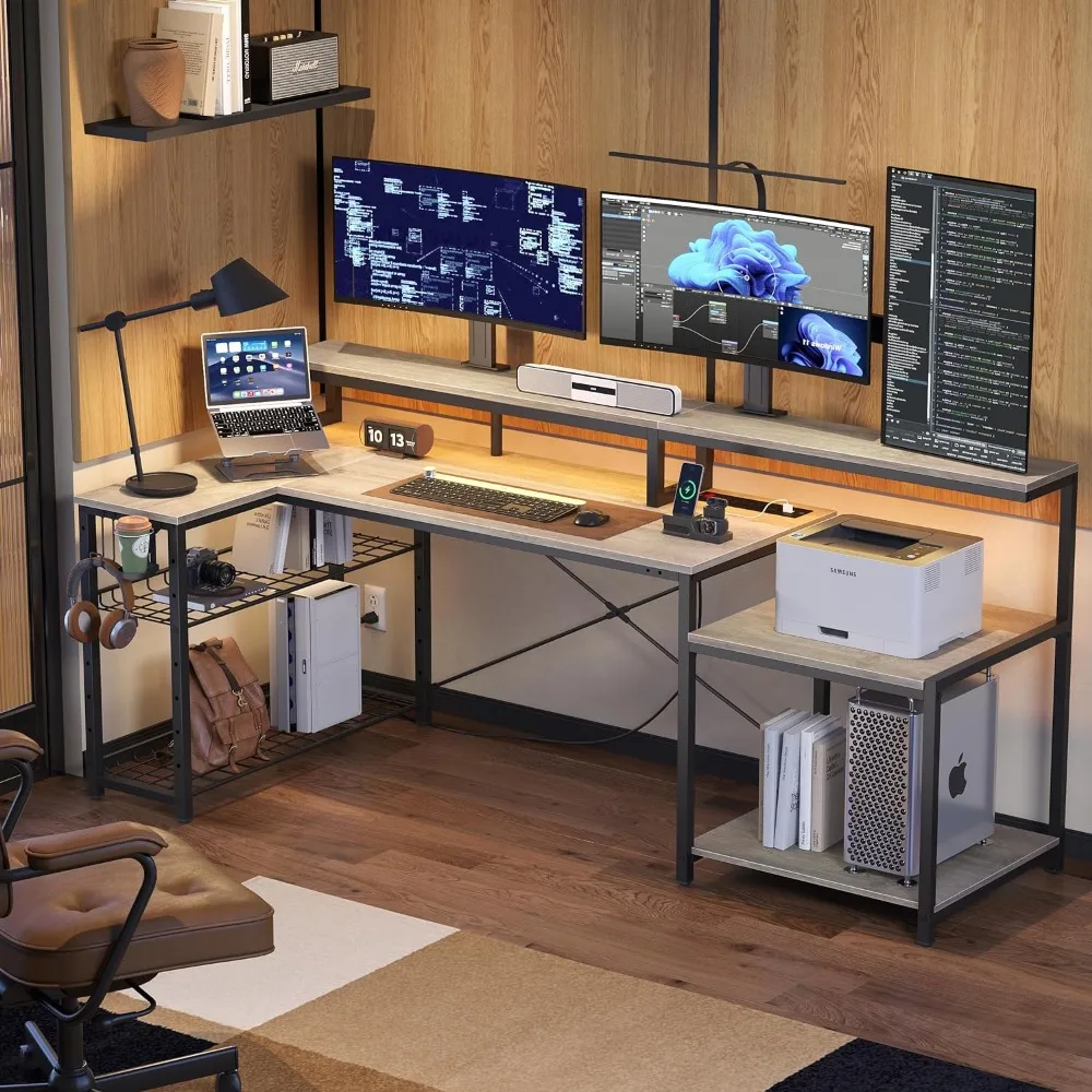 Elevate your gaming or working experience with our LED computer desk! Its spacious design comfortably fits three monitors and one laptop, while the corner desk layout allows for easy access to your entire workspace. With 4 AC sockets and 2 USB ports, you can power up to 6 devices at once. The built-in RGB light strip offers 20 static colors and 22 dynamic modes to enhance your setup. Plus, with three adjustable heights and tilt options, our desk caters to your comfort. Choose from a sleek 3D carbon fiber or elegant P2 particleboard finish. Upgrade your setup today!