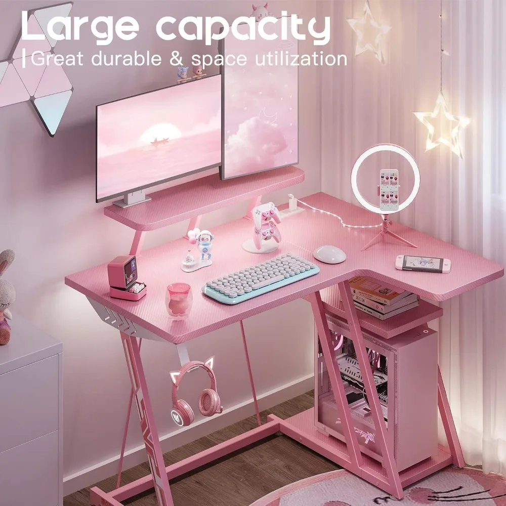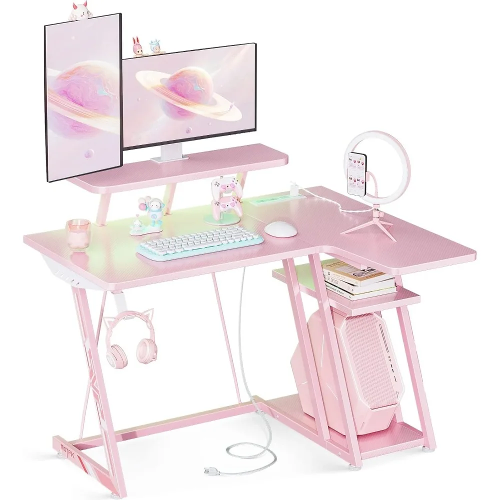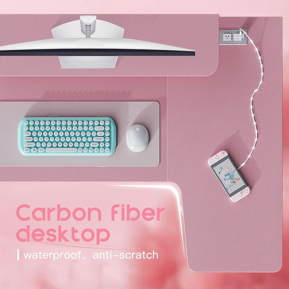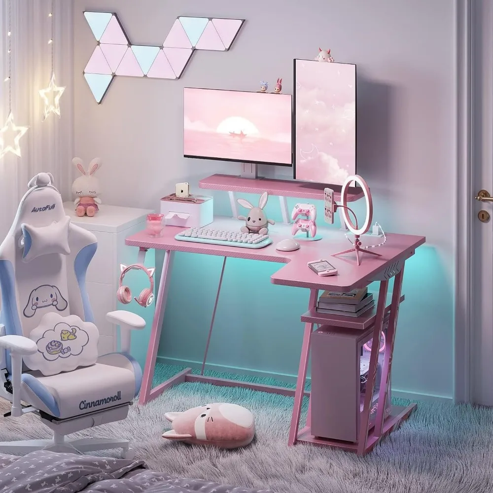 Pink L-shaped Gaming Desk with LED Lights