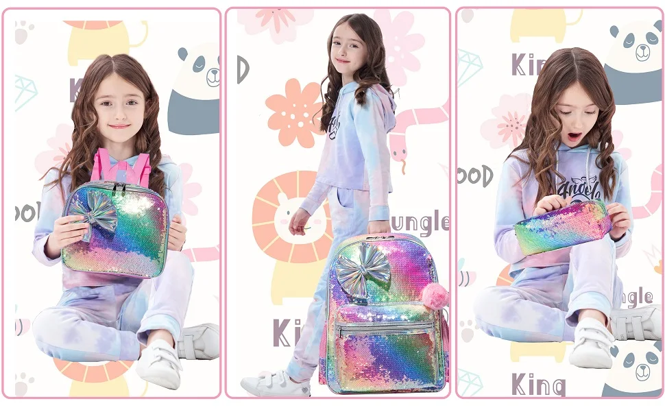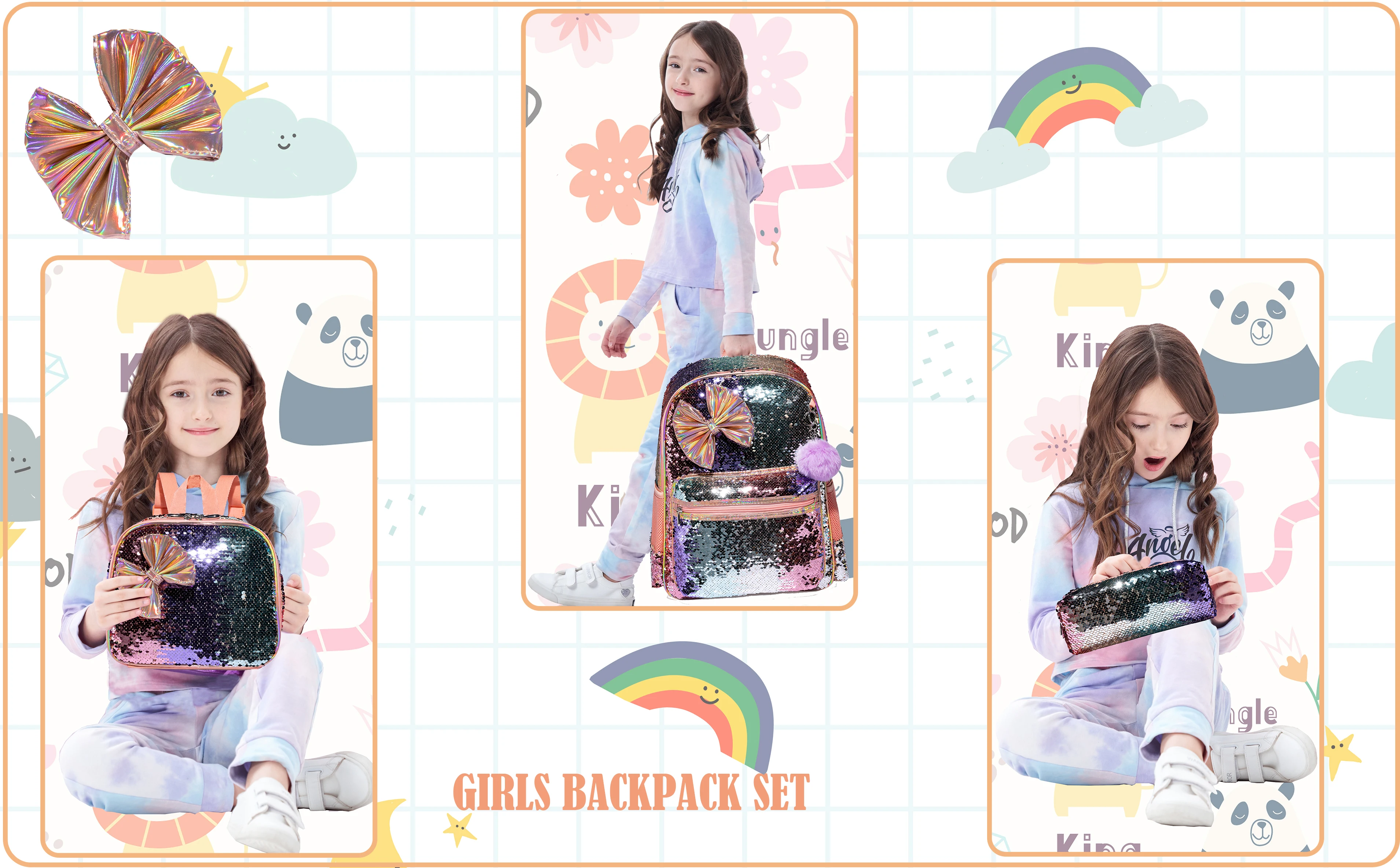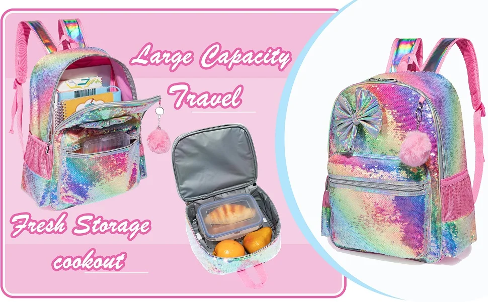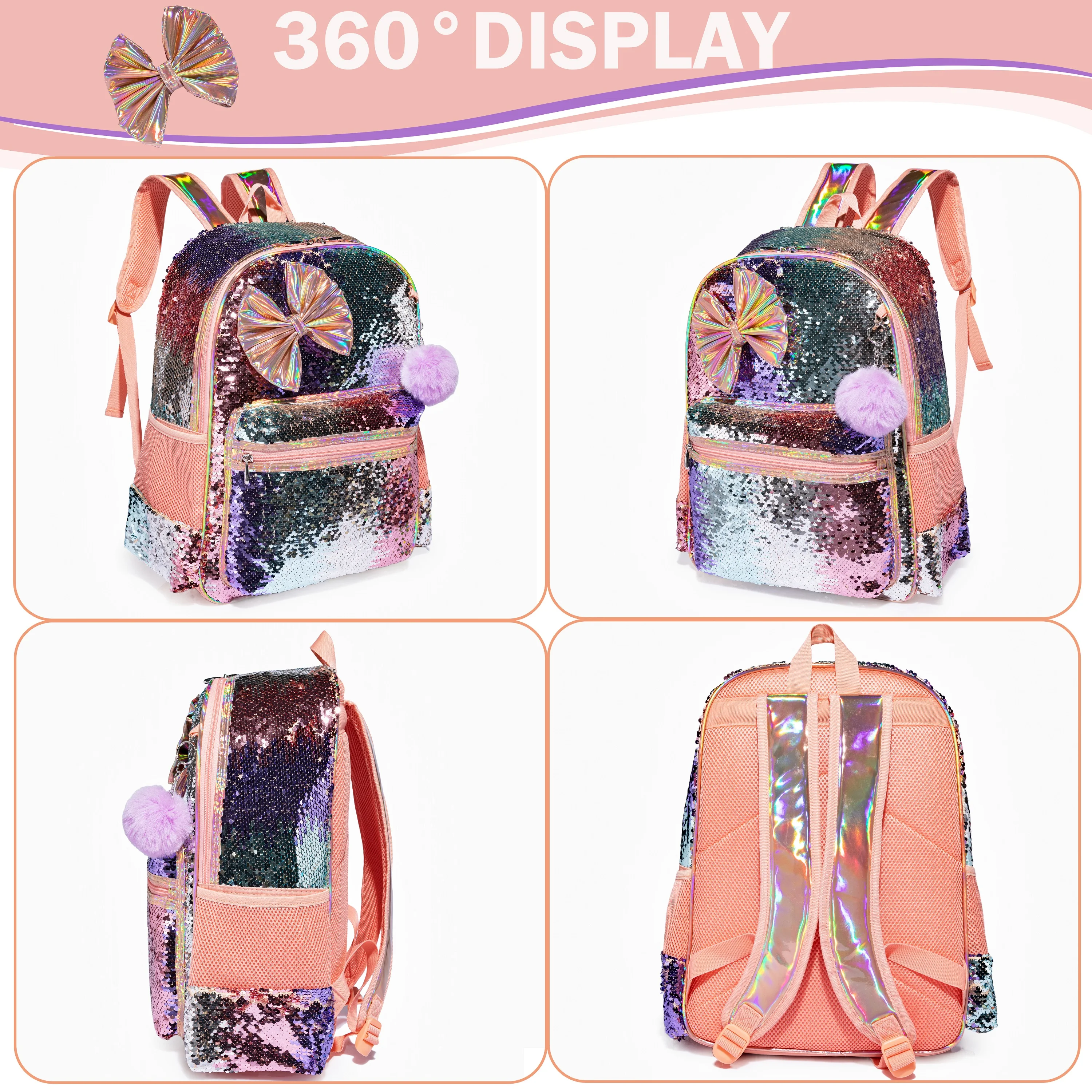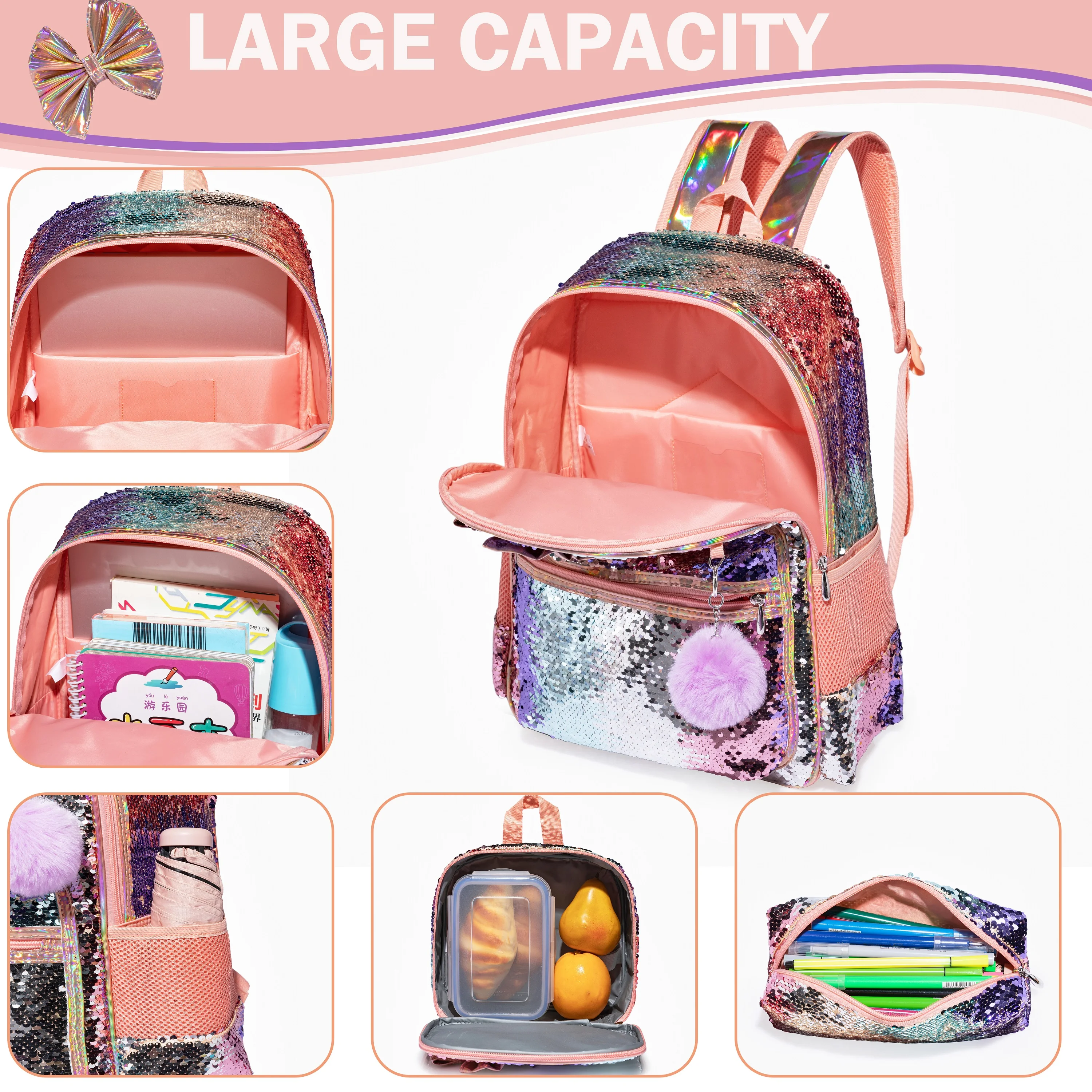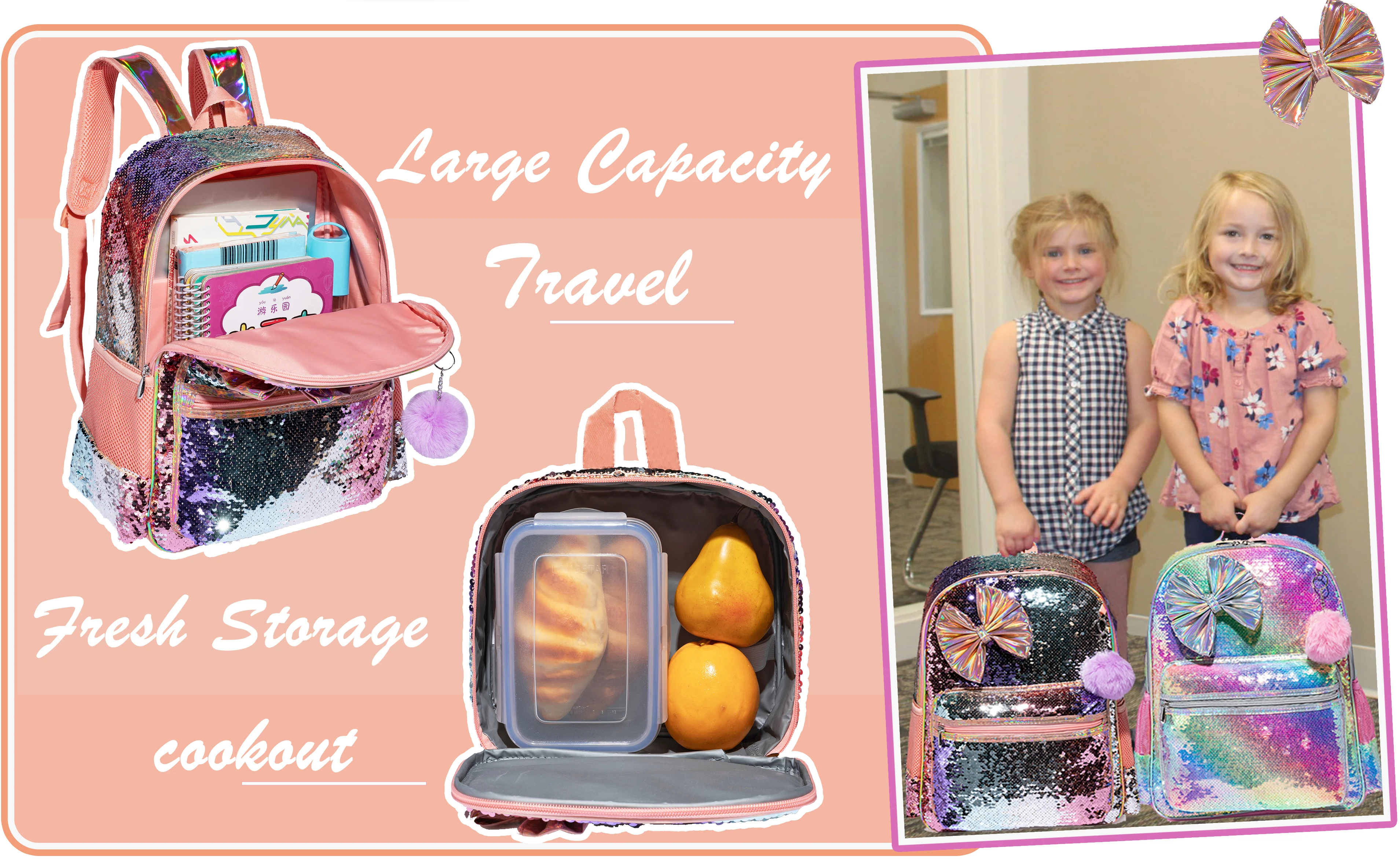 Kids Girls Bowknot Cute Sequin School Backpack with Lunch Box